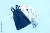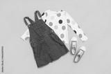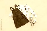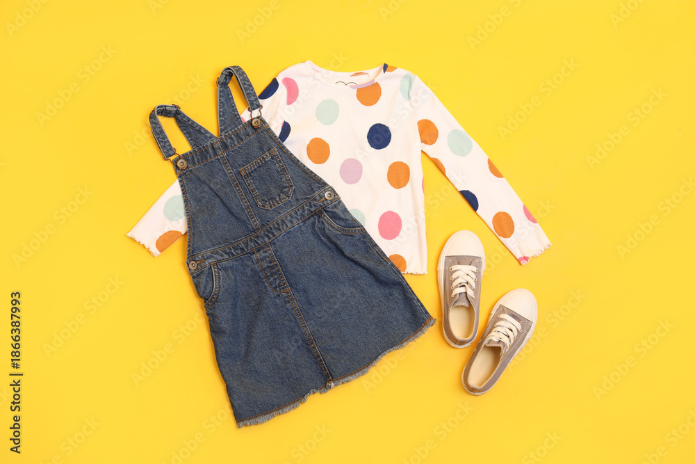 Flat lay composition with stylish child clothes and shoes on yellow background