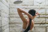 woman taking shower with long wet hair under rainfall showerhead in modern stone-walled bathroom, fresh and relaxing moment, natural light, casual underwear