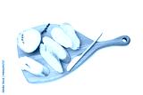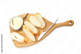 Slices of baguette with butter, thyme and knife isolated on white, top view