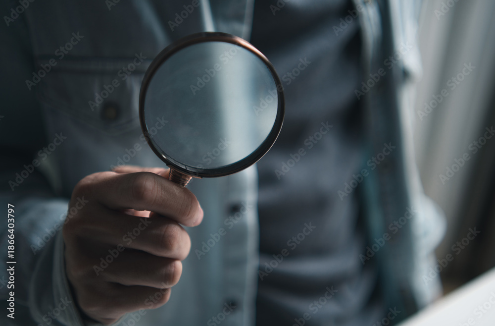 Hand holding a magnifying glass for concept of investigation, discovery, search data, research, seo and professional scrutiny for business marketing trends