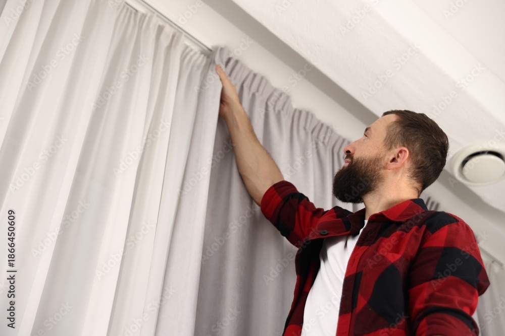 Man hanging up window curtains at home, low angle view. Space for text