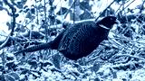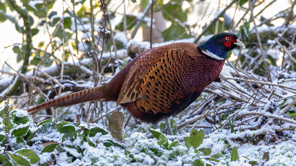Male pheasant in an English wood just after a light fall of snow.