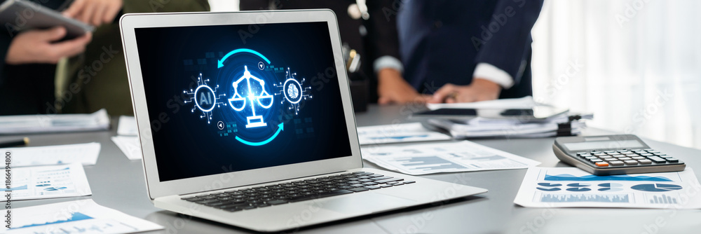AI ethics responsibility standard law and rules on computer screen provide report of AI ethic transparency preventing technology crime. brisk