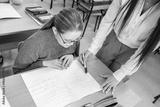 The students are taking an exam in the classroom, focused on their papers. The teacher walks around the room, quietly checking on their progress.