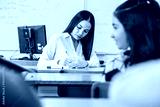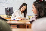 A small group of students is in their elementary classroom while a mixed-race teacher guides them through a math and geometry lesson. She is asking questions and helping them stay focused as they work