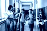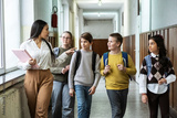 The teacher walks through the school lobby while speaking with her students as class is about to begin. The moment feels relaxed and friendly, with everyone easing into the school day.