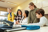 A small group of students is in their elementary classroom while a mixed-race teacher guides them through a math and geometry lesson. She is asking questions and helping them stay focused as they work
