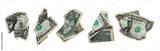 Set one dollar bill flying, crumpled and folded banknote isolated on white background, clipping path