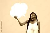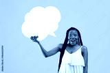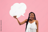 Shocked Afro woman holding blank speech bubble with mockup for ad design on pink studio background. Surprised black woman with cornrows showing empty word box, free space