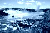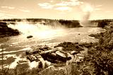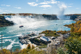 Niagara Falls American Falls and Horseshoe Falls in a sunny day in autumn foliage season. Niagara City Cruise Boat Tour.