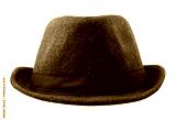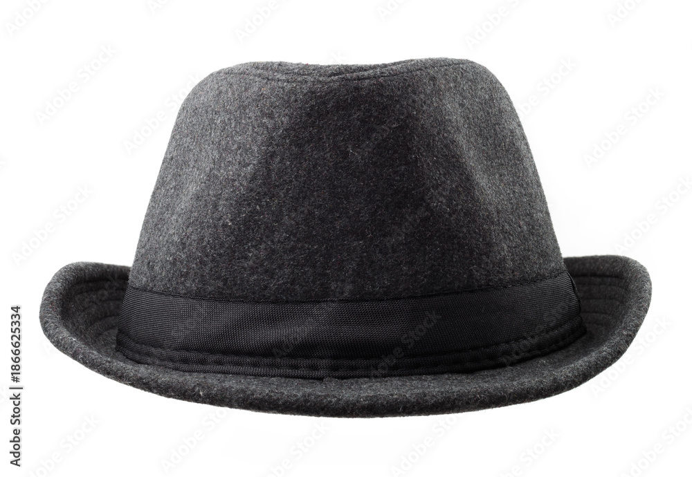 Grey felt hat with black ribbon isolated on a white background. A classic dark gray wool fedora hat with a black ribbon band, shot straight-on in a studio.
