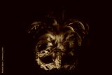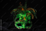 Venetian green carnival mask. A green mask with colorful feathers rests on dark fabric.