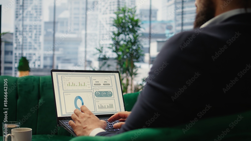 Confident leader reviews sales trends and budget reports in his smart office, ensuring profitability and company success through effective decision making and strategic planning. Camera A.