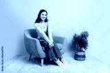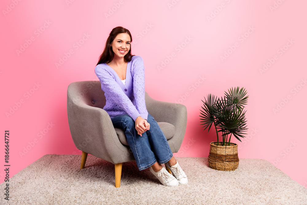 Young chic woman sits in a cozy chair against pink backdrop wearing lavender cardigan smiling at home with a potted plant nearby