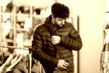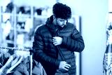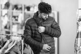 Undetermined young man posing in warm down jacket during shopping in retail outlet
