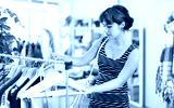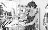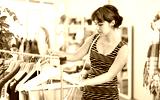 Girl chooses fashionable dresses or tops in a clothing store
