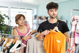 In sales area of store, young man customer chooses color and style of T-shirt, accompanying girl help to shopping boyfriend