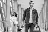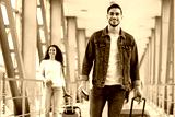 Smiling Middle Eastern Man And Woman Walking With Luggage At Airport, Happy Young Arab Male And Female Holding Suitcases, Having Air Journey, Ready For Vacation Trip, Selective Focus On Guy