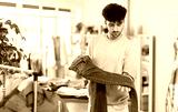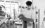 Interested young adult inspecting pair of jeans in clothing store, carefully considering comfort and cut to match daily style