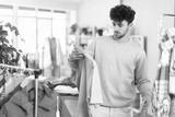 Guy spend time in shop and chooses winter T-shirt. Changing wardrobe, shaping style of clothing. Style and fashion look, modern trends.
