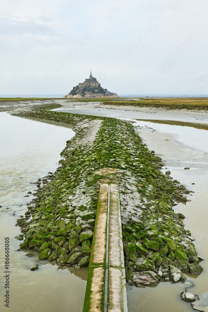 MONT SAINT MICHEL, FRANCE - September 26, 2017: Water dam of mont-saint-michel abbeyblueconstructiondamerodingfranceheritagehistoricalhistoryislandlandscapelow tidemichelmontmountnaturenewnormandyoldr