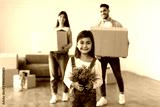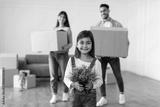 House Move And Relocation Concept. Portrait Of Cheerful Family Of Three Housing, Selective Focus On Happy Smiling Little Girl Holding Plant, Parents Carrying Cardboard Boxes In Blurred Background