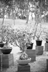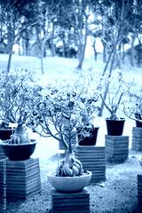 Coloful adenium obesum blossom in pot on green grass garden background
