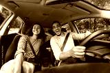 Emotional millennial couple enjoying journey by auto, shot from automobile dashboard, copy space. Excited middle-eastern guy and his pretty girlfriend going summer vacation by car