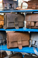 Close up of stylish, fashionable leather bags for man in differents colors, blue, brown, red, black. Street shop fastival in old town at Gdansk, Poland. Fashion.