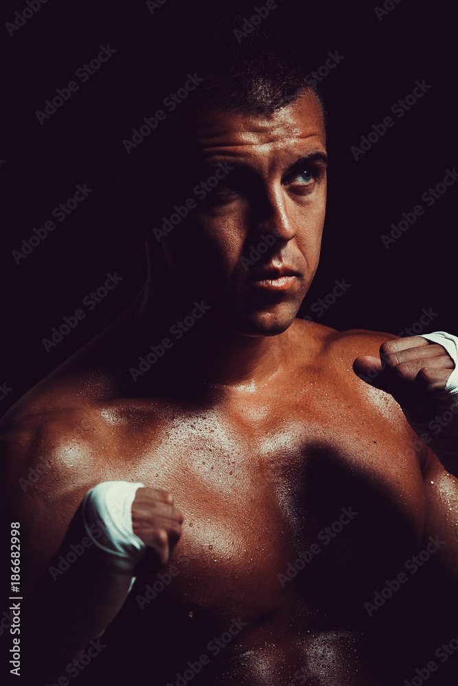 Muscular young man boxer wrapping hand with bandage. Fighter Man concept.