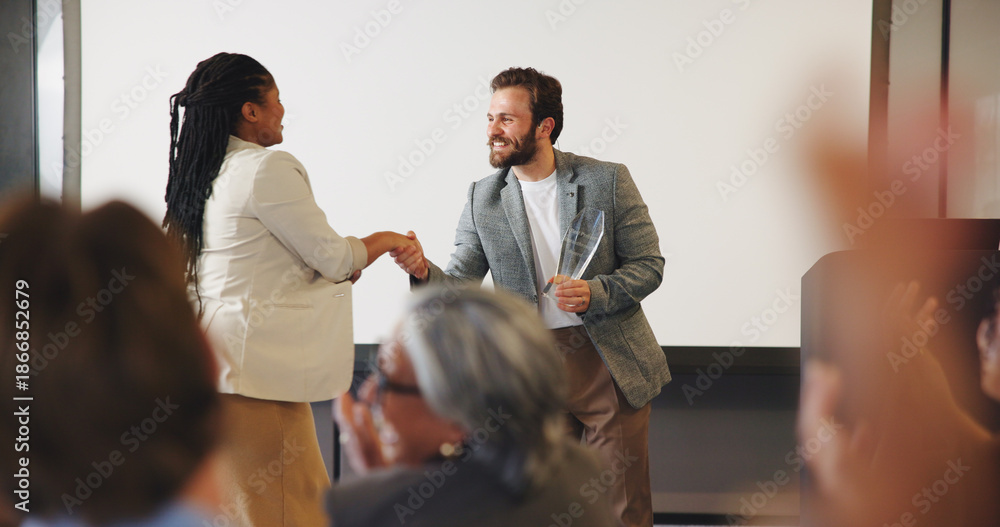 Handshake, audience and speaker with award for presentation, business conference or event. Workshop, shaking hands and prize announcement with coach, achievement and trophy for career development
