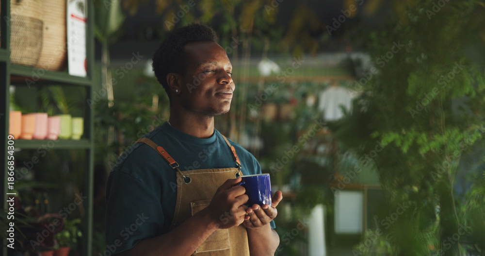 Relax, coffee and nursery with black man in store for calm, environment and sustainability. Entrepreneur, caffeine beverage and peace with person and breathing in shop for drinking herbal tea