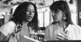 Cafe owner, woman and meeting with tech for online inventory checklist, staff schedule or review supplier info. People, boss and waitress on tablet for menu plan, laptop and coffee shop budget chat