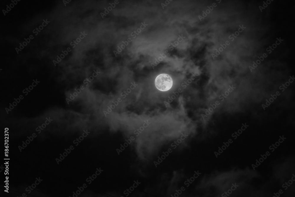Full moon in the sky with clouds at night. Real Photos