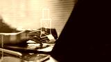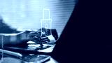 Secure login and password encryption concept with digital lock interface on laptop keyboard, showing data privacy, access control, and cybersecurity protection in modern technology systems.