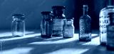 Poison bottle with skull and bones stands among pharmaceutical bottles. Danger sign, symbol of death. Concept background on poison poisoning, pharmaceutical, chemistry, medical, old science topic.