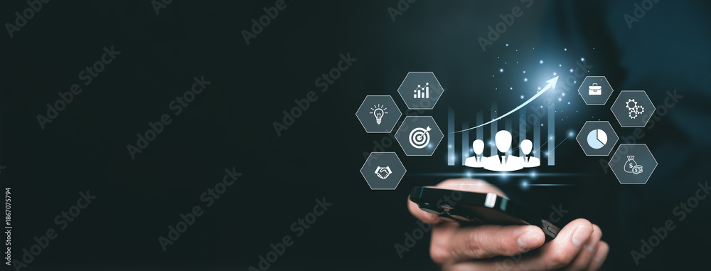 Digital business growth and team management concept with virtual icons and upward graph displayed above smartphone, corporate strategy, leadership, data-driven decision making, and modern business tec