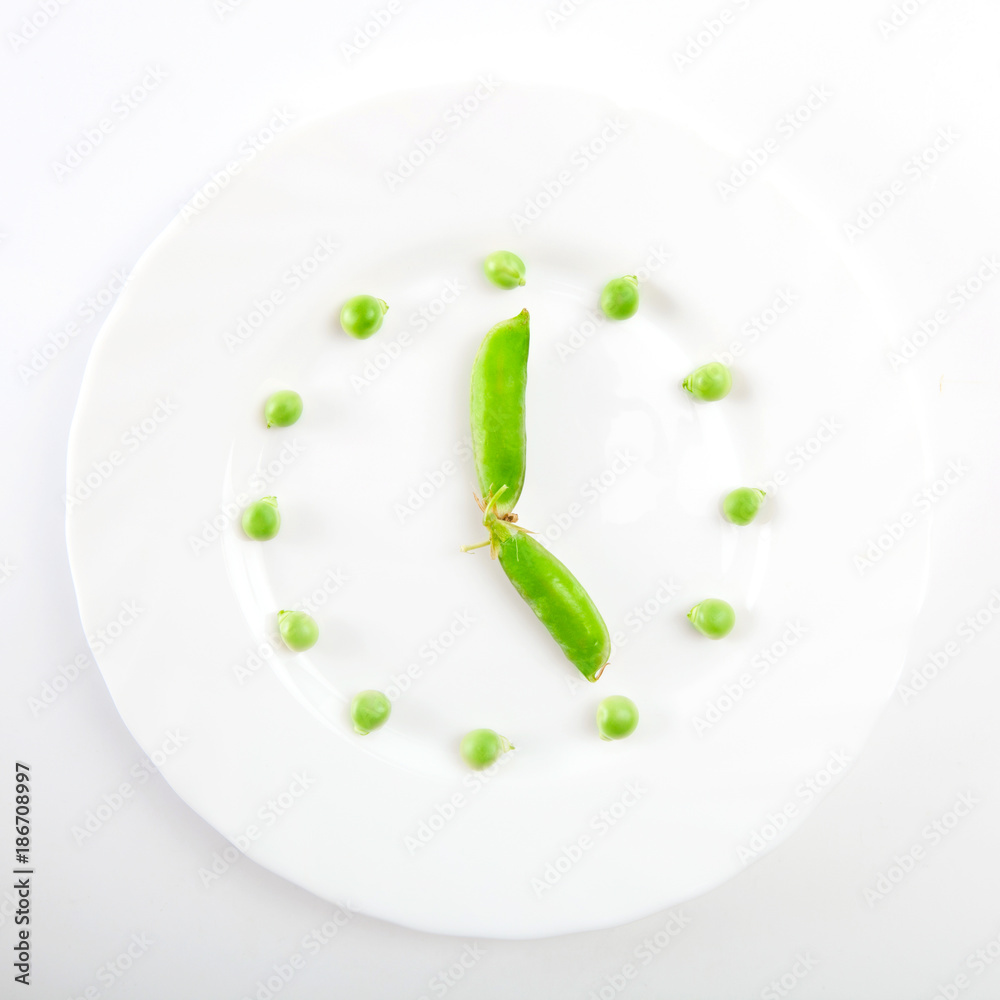 Fresh peas in a ceramic dish shot from above. Watch shape. Time of healthy eating and diet