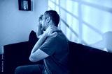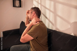 Man with neck, muscle, back and sciatica pain at home.