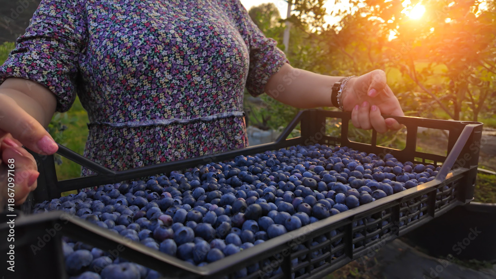 Farmer picking fresh blueberries on a farm.