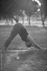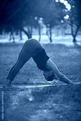 Woman practicing yoga and stretching in the park on a hot sunny summertime day.