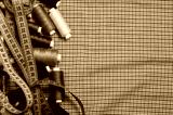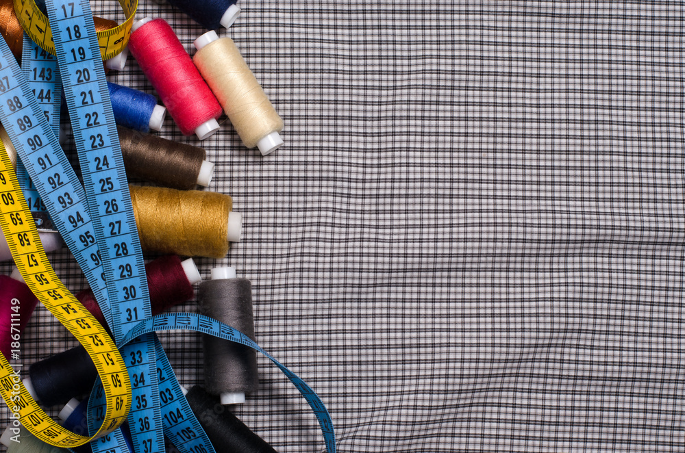 Tools and accessories for sewing. Colored sewing thread, tailor tape on gray textile background. Space for text