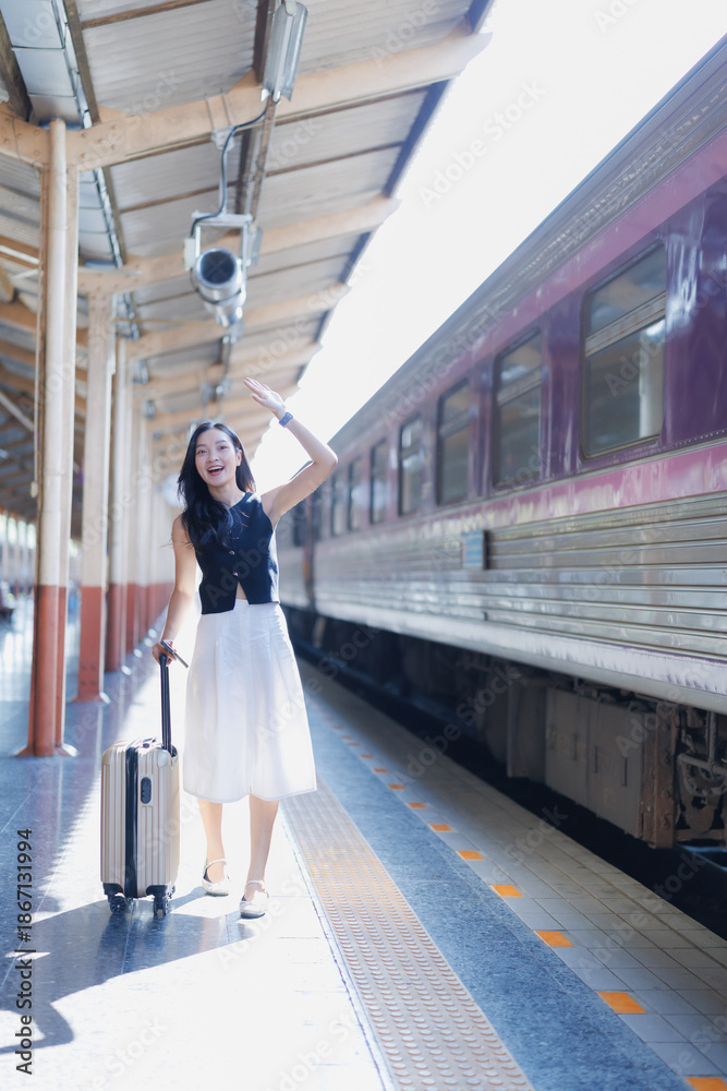 Happy young woman traveler waving from a traditional train station platform, smiling with suitcase in hand, ready for departure and an exciting urban journey or vacation adventure