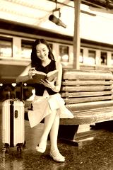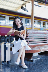 Young Asian woman sitting on a wooden bench at a train station, happily reading a book while waiting for her journey to begin, with luggage next to her on the platform