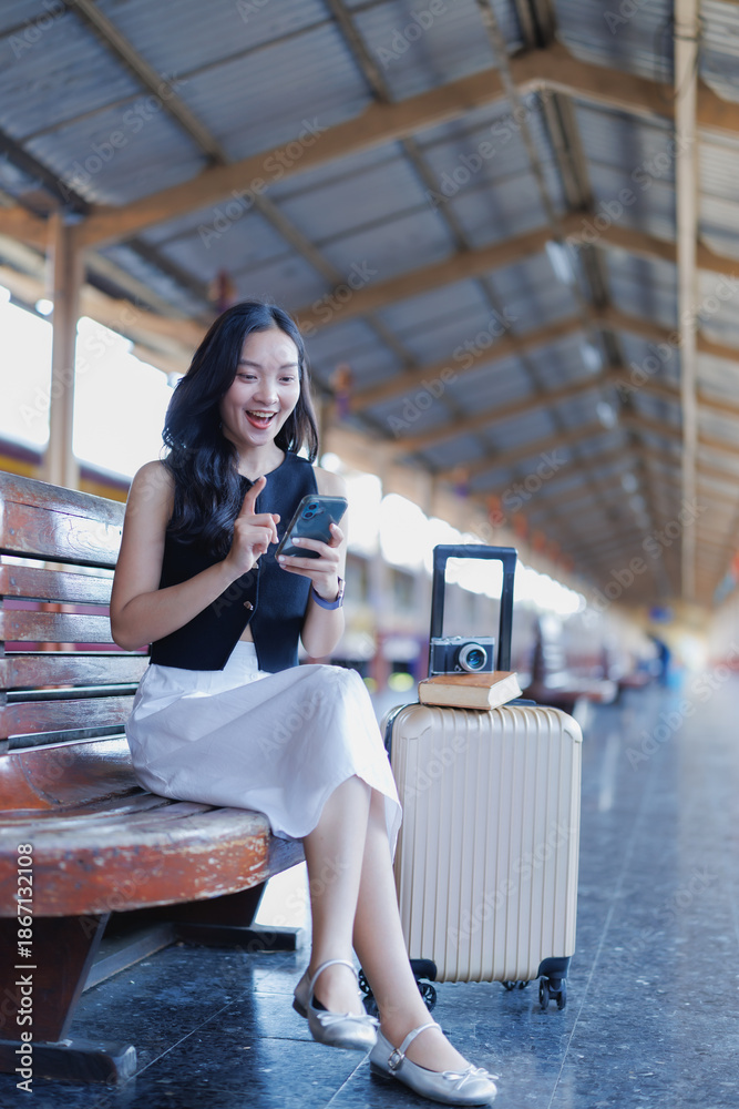 Young woman sits on a train station bench smiling at her smartphone, suitcase, camera and book beside her as she plans and connects online while waiting for her trip