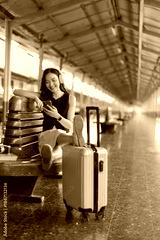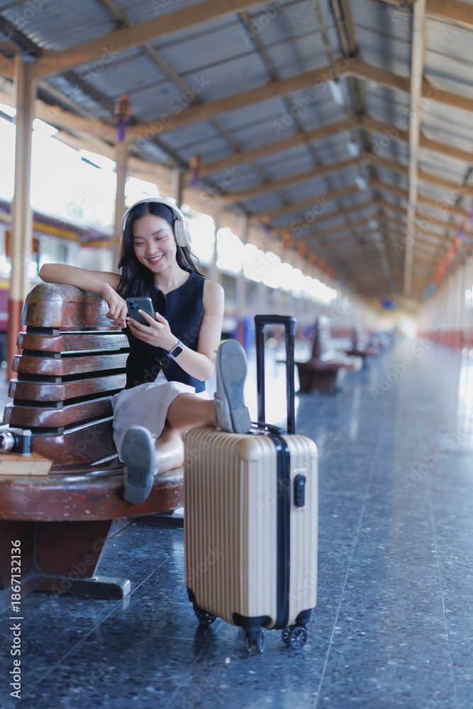 Young Asian woman sitting on a bench at a train station, smiling while using her smartphone and wearing headphones, with her luggage nearby, representing waiting and travel