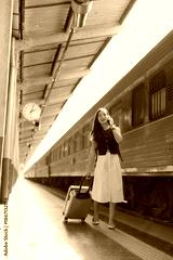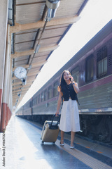 Young Asian woman chatting on mobile phone, pulling a rolling suitcase while commuting and waiting for a train on a sunny station platform, enjoying the journey