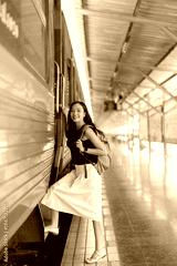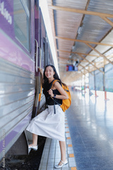 Young Asian backpacker smiling as she steps into a train at a busy urban railway station platform, beginning a solo adventure trip with excitement and independence