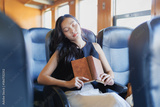 Young Asian woman sleeping peacefully in her seat while holding a book, resting during a long journey by train, illustrating travel comfort and relaxation