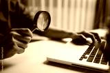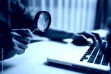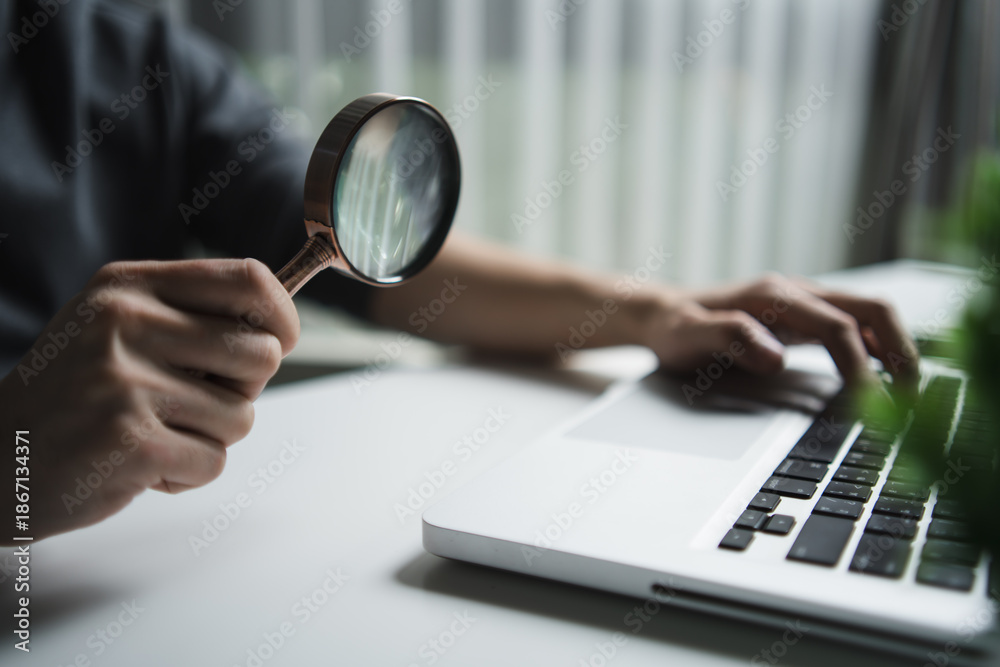 Man holding a magnifying glass over a laptop keyboard. Concept of data audit, online security research, and digital investigation. Professional analysis and finding information tool